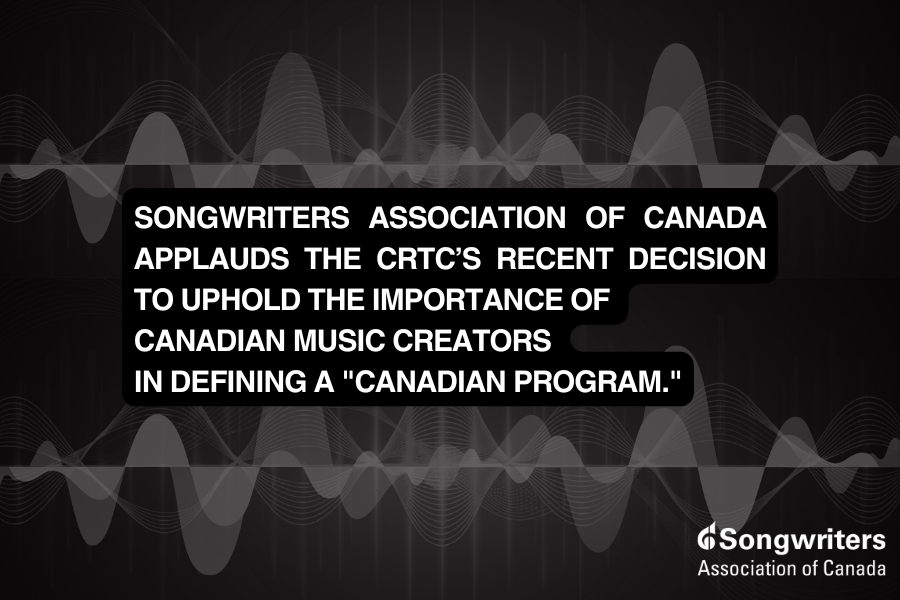 Songwriters Association of Canada applauds the CRTC’s recent decision to uphold the importance of Canadian music creators in defining a Canadian audiovisual program. This decision celebrates the role of Canadian-created music in shaping our culture, and ensures Canadian music creators remain vital contributors to Canadian audiovisual storytelling.